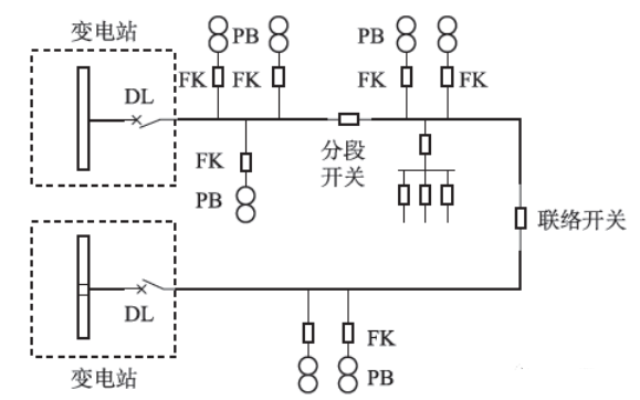 如下圖所示,其作為現(xiàn)階段典型的配電系統(tǒng)拓撲圖,變電站的10kV出線配置斷路器和對應(yīng)保護,主線路中引用開關(guān)分段,各分支線路結(jié)合負荷開關(guān)的方式進行配置,且全部開關(guān)都具有合閘等功能。因為分段開關(guān)與負荷開關(guān)在運行期間,難以斷開短路電流,所以不需要安裝保護設(shè)施。其中,圖中的DL屬于斷路器,FK屬于負荷開關(guān),而PB是配變。