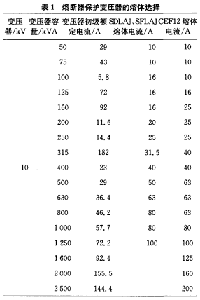 依據1989年國際配電網會議提供的材料,當油浸變壓器內產生短路缺點時,短路電弧會使油氣形成氣泡而占有原先歸于油的空間,油將壓力傳給變壓器外璧,跟著短路的持續而壓力愈來愈大,直到油箱炸裂。要使油箱不被炸裂,必須在20ms內切除缺點。斷路器的動作時間是維護動作時間和斷路器固有動作時間兩部分之和,其值不小于60ms,可見斷路器不能到達維護油浸變壓器的目的。負荷開關+熔斷器環網柜則能夠有效地維護變壓器,熔斷器維護變壓器的熔體選擇表1。