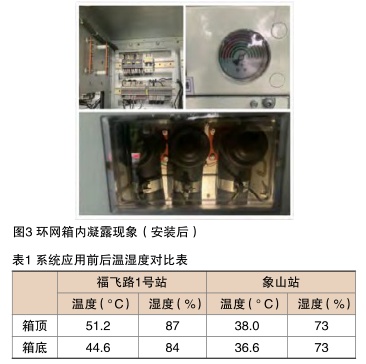 為檢驗(yàn)上述方案的實(shí)際運(yùn)行效果,在福州象山站安裝了一套上述微環(huán)境控制裝置(圖2)。為便于對比,在福州福飛路1號站安裝了環(huán)境監(jiān)控裝置,檢測柜內(nèi)環(huán)境參數(shù)。兩個環(huán)網(wǎng)站在同一天中,柜內(nèi)相同位置處最高溫濕度對比結(jié)果(表1)表明,安裝微環(huán)境控制裝置后,通過系統(tǒng)自動調(diào)控風(fēng)機(jī)運(yùn)行的時間,降低環(huán)網(wǎng)箱內(nèi)空氣溫度,可促進(jìn)箱內(nèi)和電纜溝內(nèi)的溫濕度趨于均衡,減少電纜溝內(nèi)潮濕空氣通過電纜接線孔進(jìn)人開關(guān)柜,從而防止開關(guān)柜內(nèi)電氣元件表面的閃絡(luò)現(xiàn)象發(fā)生。系統(tǒng)運(yùn)行后二次艙和電纜艙凝露完全消除。