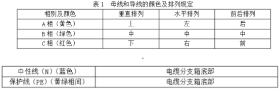 (1)選用選用矩形母線,質料為T2電工銅。并選用不同相色熱縮套管做絕緣處理。熱縮套管不得開裂和起皺,母線接頭處用熱縮絕緣盒關閉。絕緣熱縮護套材料應具有阻燃、防腐、抗老化的要求,老化壽數不小于30年,具體試驗方法和要求參照GB/T2951.14中規則實施。(2)銅排截面的挑選應確保能夠耐受IEC60298中推薦的額定短時耐受和峰值耐受電流的要求,N相(L0)母線與三相母線規范相同,PE排截面不低于相排截面的1/2。其間設于戶外的低壓電纜分支箱配備4根母排(3L+PEN),設于戶內的低壓電纜分支箱配備5根母排(3L+N+PE)。(3)設備中母線和導線的顏色及擺放應符合GB/T4026和GB7947及表1的規則;