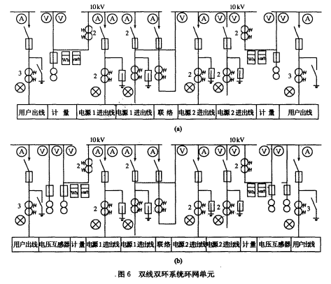 環式配電體系中的用電單位配電體系接線(環網單元)的電源進出線柜不設保護設備,見圖4~6.放射式或樹干式配電體系的用電單位終端配電所,進出柜應設保護設備。