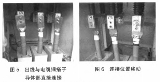 穿墻套管下部為出線,與電纜銅搭子導體部直接聯(lián)接,如圖5所示。撤消聯(lián)接螺栓后發(fā)生聯(lián)接方位移動,如圖6所示。此現(xiàn)象說明電纜銅搭子與穿墻套管存在很大的聯(lián)接變形,并發(fā)生應(yīng)力,在電纜通電后發(fā)生的電動力和聯(lián)接應(yīng)力進一步作用于穿墻套管,使得穿墻套管發(fā)生碎裂。